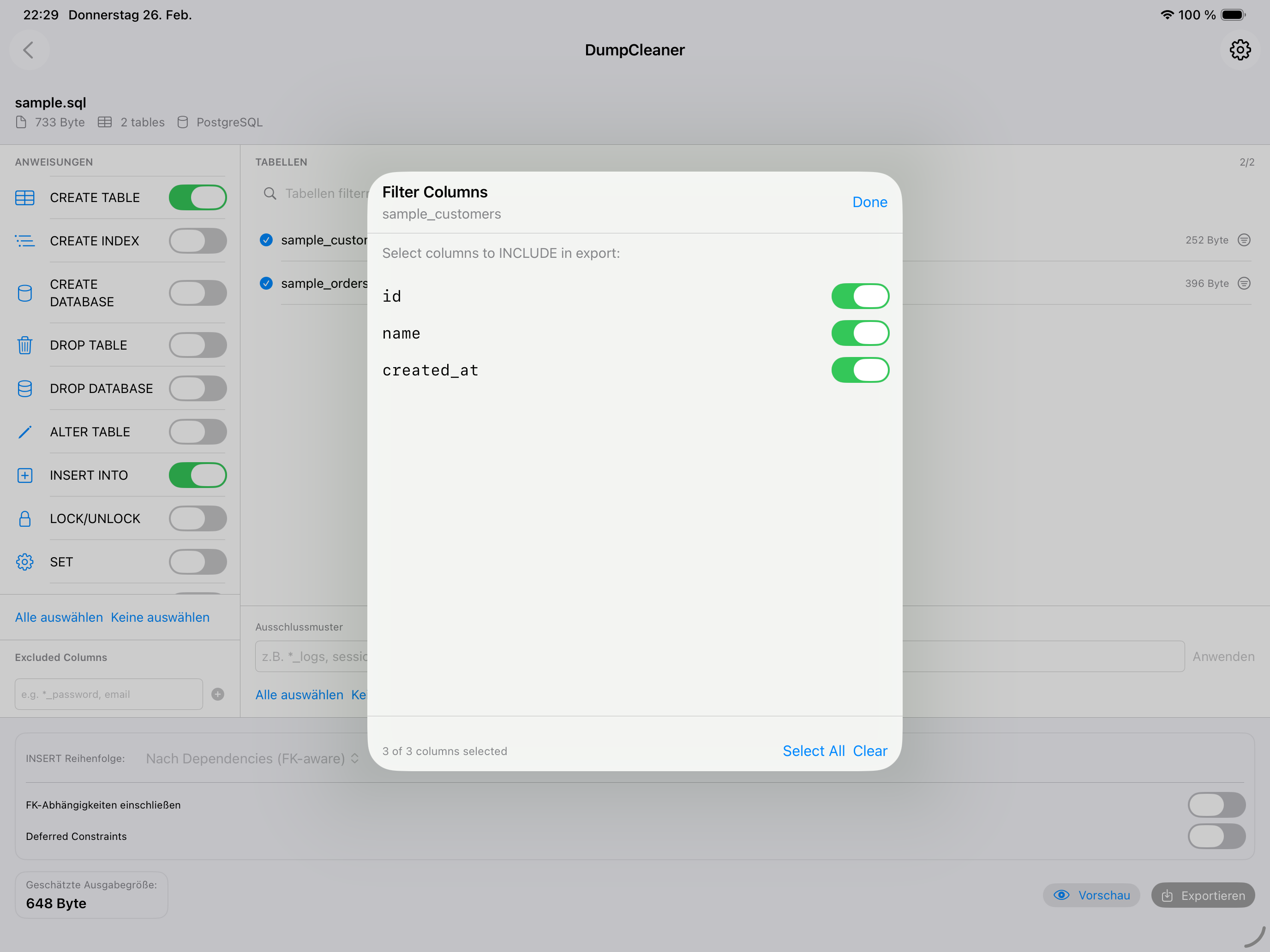 DumpCleaner ist die native macOS- & iPadOS-App zum Filtern und Bereinigen großer SQL-Dump-Dateien. Einfach per Drag & Drop öffnen, Tabellen auswählen, filtern und exportieren – ohne Terminal, ohne Kommandozeile.