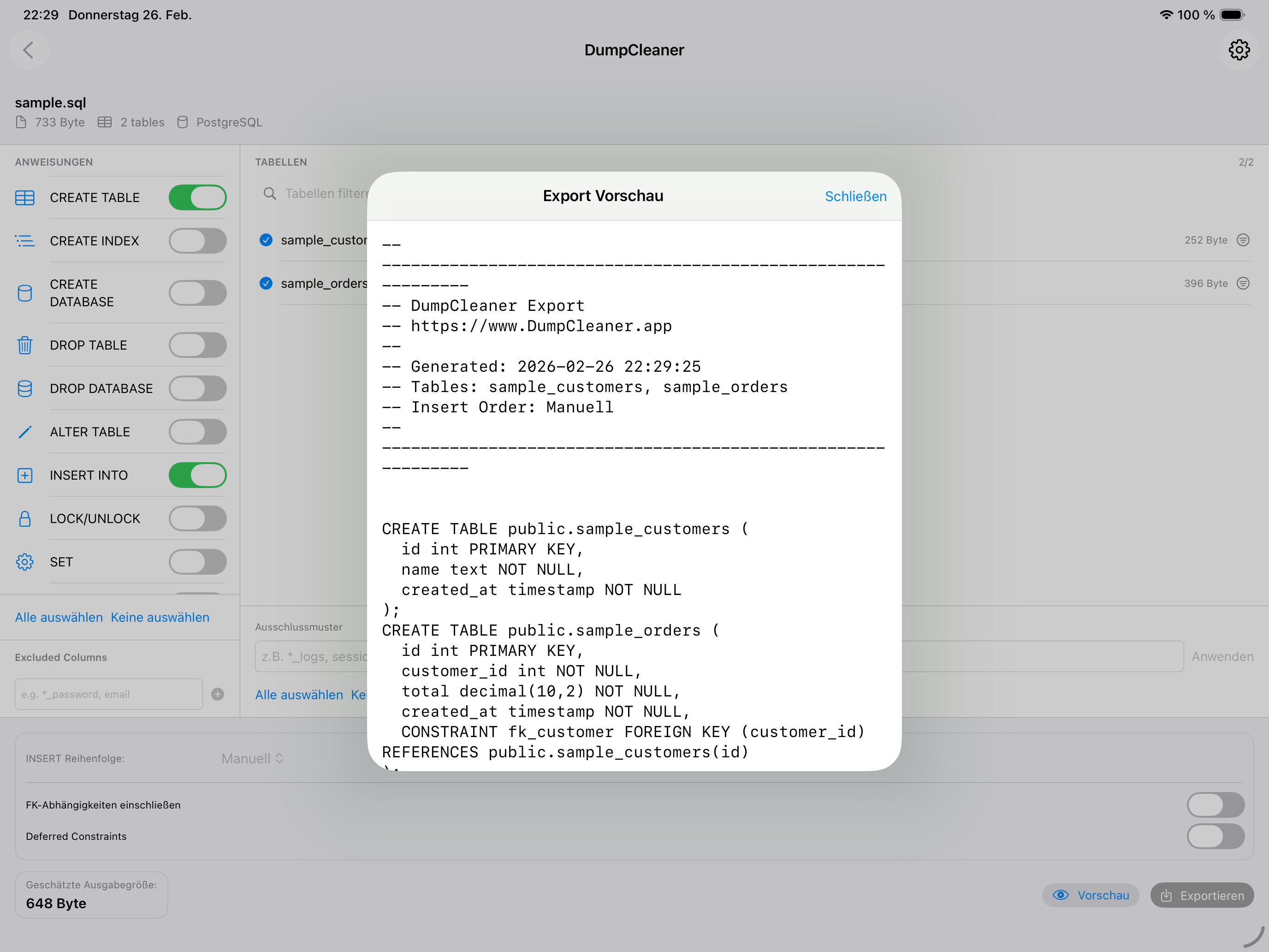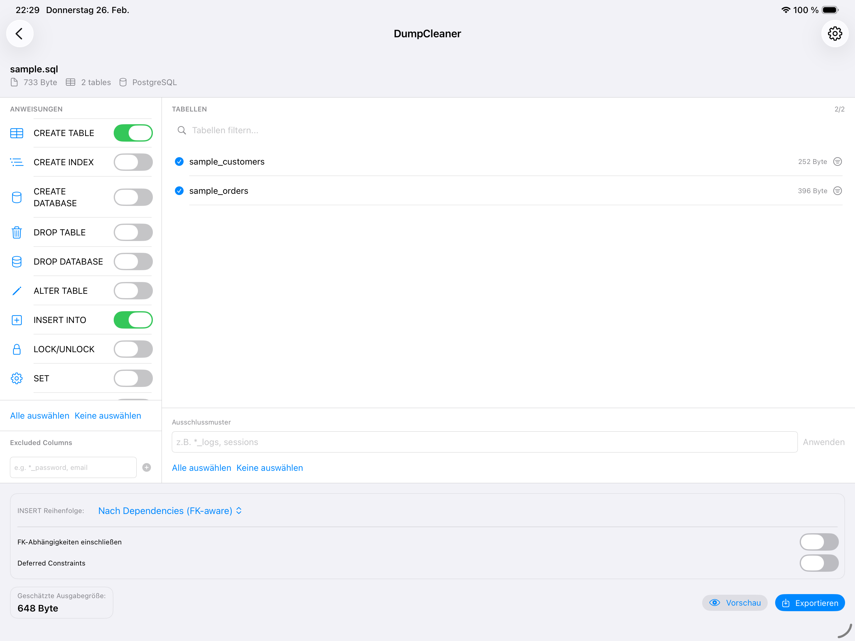 Datei ziehen, Tabellen wählen, exportieren. Fertig.