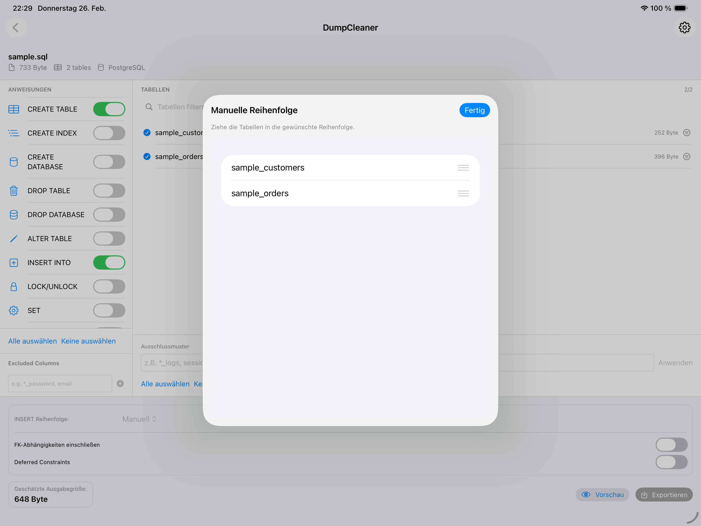• Originalreihenfolge, alphabetisch, automatisch nach FK-Abhängigkeiten oder manuell per Drag & Drop
