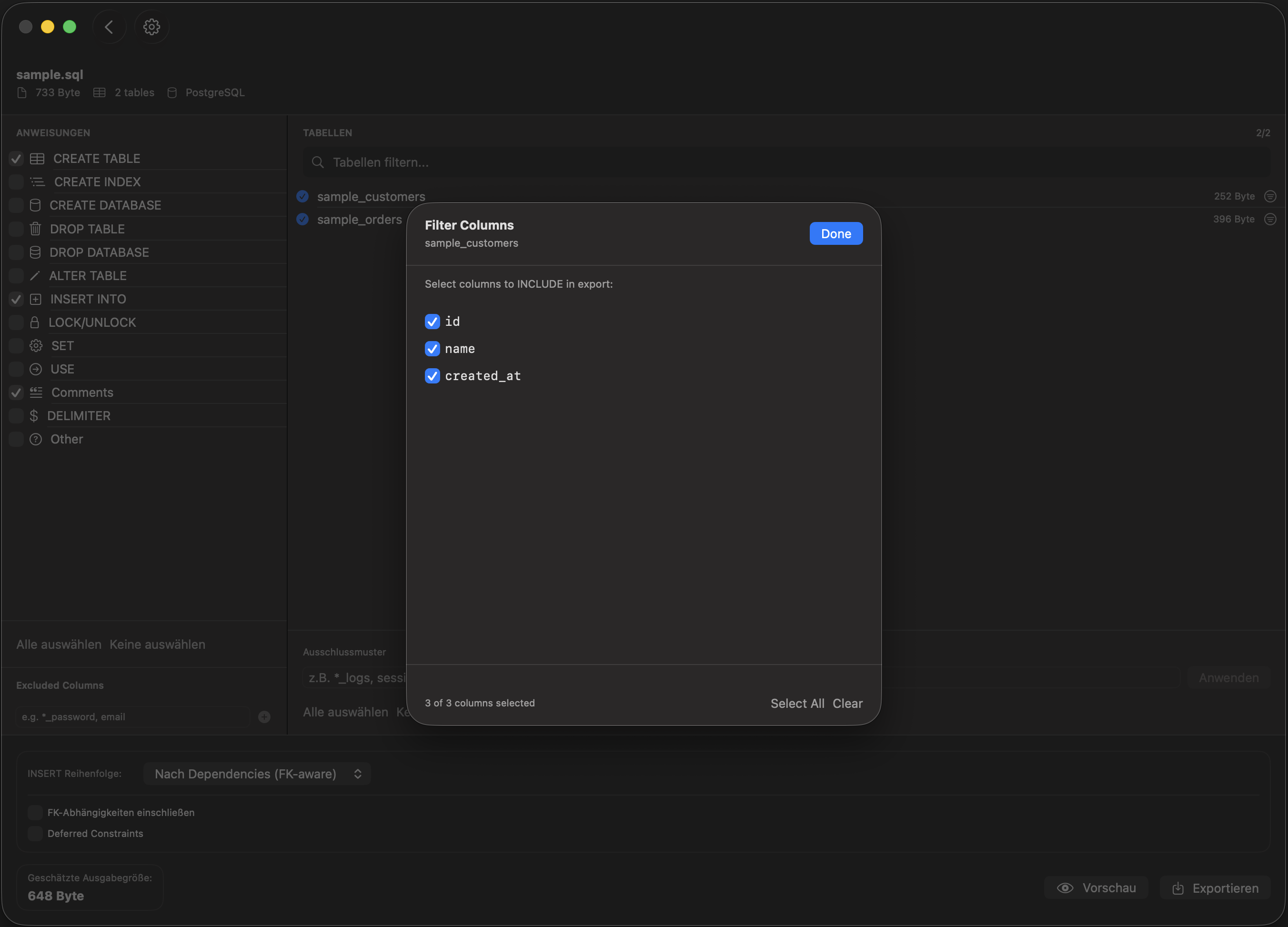 • Wähle einzelne Tabellen und Spalten per Checkbox aus – oder schließe sie aus