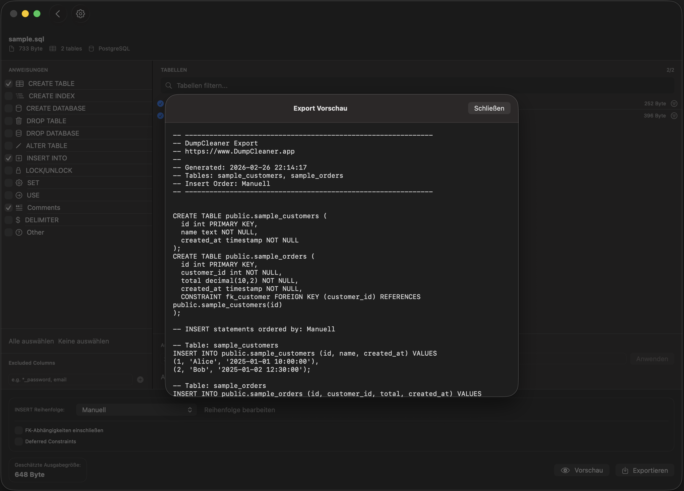 DumpCleaner ist die native macOS- & iPadOS-App zum Filtern und Bereinigen großer SQL-Dump-Dateien. Einfach per Drag & Drop öffnen, Tabellen auswählen, filtern und exportieren – ohne Terminal, ohne Kommandozeile.